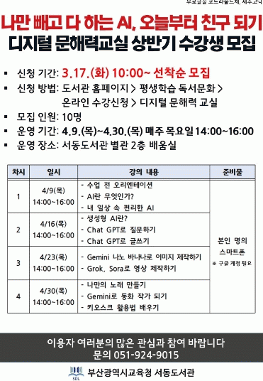 [´º½ºÅë °û¸íÈÆ ±âÀÚ]ºÎ»ê±¤¿ª½Ã±³À°Ã»¼µ¿µµ¼°ü(°üÀå ÀÌÁø¿Á)Àº ¿À´Â 4¿ù 9ÀϺÎÅÍ 30ÀϱîÁö ¸ÅÁÖ ¸ñ¿äÀÏ ¼µ¿µµ¼°ü º°°ü¿¡¼ Áö¿ª ÁֹΠ10¸íÀ» ´ë»óÀ¸·Î »ó¹Ý±â µðÁöÅÐ ¹®ÇØ·Â ±³½Ç ¡®³ª¸¸ »©°í ´Ù ÇÏ´Â AI, ¿À´ÃºÎÅÍ Ä£±¸µÇ±â¡¯¸¦ ¿î¿µÇÑ´Ù.