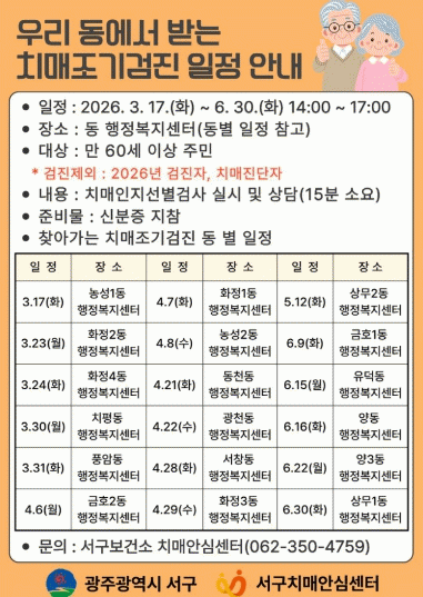 °ËÁø ´ë»óÀº Ä¡¸Å Áø´ÜÀ» ¹ÞÁö ¾ÊÀº ¸¸ 60¼¼ ÀÌ»ó ¼±¸ ÁÖ¹ÎÀÌ´Ù. °ËÁøÀº ±â¾ï·Â, ÁÖÀÇÁýÁß·Â, ¾ð¾î±â´É, ÀÌÇØ¡¤ÆÇ´Ü·Â µîÀ» È®ÀÎÇÏ´Â ¹®Áø½Ä ÀÎÁö¼±º°°Ë»ç(CIST)¸¦ Áß½ÉÀ¸·Î ÁøÇàÇÑ´Ù. °Ë»ç °á°ú Ä¡¸Å°¡ ÀǽɵǴ °æ¿ì¿¡´Â Ä¡¸Å¾È½É¼¾ÅÍ¿¡¼ ½Å°æ½É¸®°Ë»ç µî Áø´Ü°Ë»ç¸¦ ½Ç½ÃÇϰí ÇÊ¿ä ½Ã Çù¾àº´¿ø °¨º°°Ë»ç±îÁö ¿¬°èÇØ Á¤È®ÇÑ Áø´Ü°ú ü°èÀûÀÎ °ü¸®°¡ ÀÌ·ïÁöµµ·Ï Áö¿øÇÒ °èȹÀÌ´Ù.