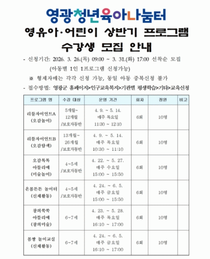 ¼ö°»ý ¸ðÁý±â°£Àº 3¿ù 26ÀϺÎÅÍ 3¿ù 31ÀϱîÁöÀ̸ç, ¼±Âø¼øÀ¸·Î ¸ðÁýÇÑ´Ù. ±³À°À» Èñ¸ÁÇÏ´Â ¿µ±¤±º¹ÎÀº ¿µ±¤±ºÃ» ´ëÇ¥ ´©¸®Áý ¡°Àα¸±³À°º¹Áö¡æ±â°üº° Æò»ýÇнÀ¡æ±âŸ¡æ±³À°½Åû¡± ¸Þ´º¸¦ ÅëÇØ ½ÅûÇÒ ¼ö ÀÖ´Ù.