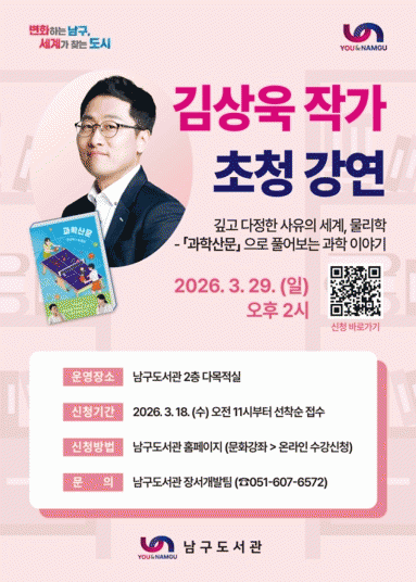 [´º½ºÅë °û¸íÈÆ ±âÀÚ]ºÎ»ê ³²±¸´Â ¿À´Â 3¿ù 29ÀÏ ¿ÀÈÄ 2½Ã ³²±¸µµ¼°ü¿¡¼ '±è»ó¿íÀÇ °úÇÐ °øºÎ', '¶³¸²°ú ¿ï¸²', '°úÇл깮' µîÀÇ ÀúÀÚÀÎ ±è»ó¿í ±³¼ö¸¦ ÃÊÃ»ÇØ ÀÛ°¡ °¿¬È¸¸¦ °³ÃÖÇÑ´Ù°í ¹àÇû´Ù.