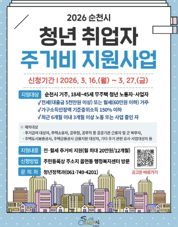 [´º½ºÅë ±è±¤¿ ±âÀÚ] ¼øÃµ½Ã´Â ¼º½ÇÈ÷ ÀÏÇϴ û³âÀÇ ÁÖ°Å ¾ÈÁ¤°ú °æÁ¦Àû ÀÚ¸³ ±â¹Ý ¸¶·ÃÀ» À§ÇØ'û³â Ãë¾÷ÀÚ Áְźñ Áö¿ø»ç¾÷' ´ë»óÀÚ¸¦ ¿À´Â 27ÀϱîÁö ¸ðÁýÇÑ´Ù.