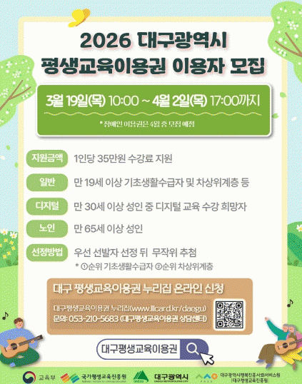[´º½ºÅë ¾È»óµ· ±âÀÚ] ´ë±¸±¤¿ª½Ã´Â ±³À° °ÝÂ÷¸¦ ÇØ¼ÒÇÏ°í ½Ã¹ÎµéÀÇ ¿ª·® °³¹ß°ú ÀھƽÇÇöÀ» µ½±â À§ÇØ 3¿ù 19ÀϺÎÅÍ ¡®2026³â ´ë±¸±¤¿ª½Ã Æò»ý±³À°ÀÌ¿ë±Ç¡¯ 1Â÷ ÀÌ¿ëÀÚ ¸ðÁýÀ» ½ÃÀÛÇÑ´Ù.