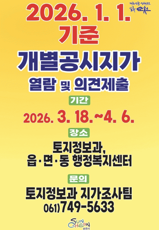 [´º½ºÅë ±è±¤¿ ±âÀÚ] ¼øÃµ½Ã´Â 2026³â 1¿ù 1ÀÏ ±âÁØ °³º°°ø½ÃÁö°¡ÀÇ ¿¶÷ ¹× ÀǰßÁ¦ÃâÀ» 3¿ù 18ÀϺÎÅÍ 4¿ù 6ÀϱîÁö Á¢¼öÇÑ´Ù°í ¹àÇû´Ù.