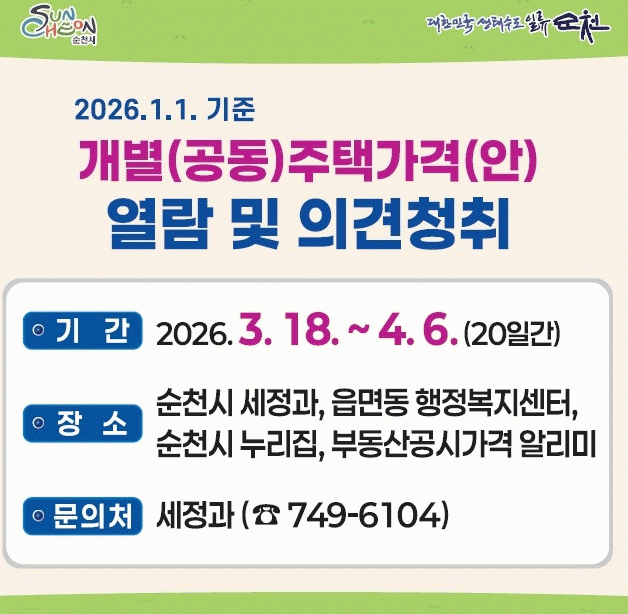 ¼øÃµ½Ã, 2026 1. 1. ±âÁØ °³º°(°øµ¿)ÁÖÅà °¡°Ý ¿¶÷ ¹× ÀǰßÁ¢¼ö
