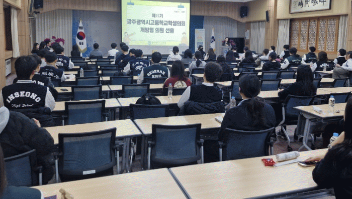8ÀÏ ½Ã±³À°Ã» ´ëȸÀǽǿ¡¼ ±¤ÁÖ °ü³» °íµîÇлýµéÀÌ 2026³âµµ ±¤ÁÖ±¤¿ª½Ã°íµîÇлýÀÇȸ °³¹æÇü ÀÇ¿øÀ» ¼±ÃâÇϰí ÀÖ´Ù.