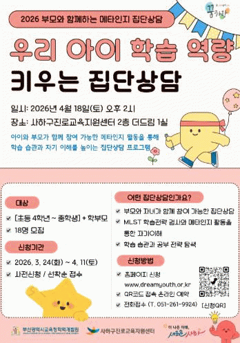 [´º½ºÅë °û¸íÈÆ ±âÀÚ]»çÇϱ¸Áø·Î±³À°Áö¿ø¼¾ÅÍ´Â ¿À´Â 4¿ù 18ÀÏ Åä¿äÀÏ ¿ÀÈÄ 2½Ã, MLST ÇнÀÀü·« °Ë»ç¿Í ºÎ¸ð¡¤ÀÚ³à °£ ÇнÀ ¿ªÁö»çÁö ¿ªÇÒ±Ø È°µ¿À» ÅëÇØ ŸÀΰú ÀÚ±â ÀÌÇØ¿¡ µµ¿òÀ» ÁÖ´Â '¸ÞŸÀÎÁö Áý´Ü»ó´ã' ÇÁ·Î±×·¥À» ¿î¿µÇÑ´Ù.