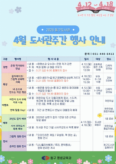 [´º½ºÅë °û¸íÈÆ ±âÀÚ]ºÎ»ê µ¿±¸´Â 4¿ù µµ¼°üÁÖ°£(4.12.~18.)À» ¸Â¾Æ µ¿±¸µµ¼°ü ¹× µ¿±¸¾î¸°ÀÌ¿µ¾îµµ¼°ü¿¡¼ ´Ùä·Î¿î µ¶¼¹®È ÇâÀ¯ Çà»ç¸¦ ¿î¿µÇÑ´Ù°í ¹àÇû´Ù.