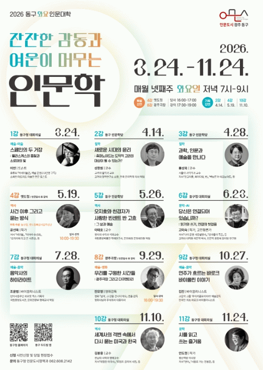 [´º½ºÅë ±è±¤¿ ±âÀÚ] ±¤ÁÖ µ¿±¸´Â ¡®ÀÜÀÜÇÑ °¨µ¿°ú ¿©¿îÀÌ ¸Ó¹«´Â Àι®ÇС¯À» ÁÖÁ¦·Î ¿¹¼ú, öÇÐ, ¿ª»ç, ¹®ÇÐ µî °¢ ºÐ¾ßÀÇ ¸í¸Á ÀÖ´Â °»çµéÀ» ÃÊÃ»ÇØ ÁøÇàÇÏ´Â ¡®µ¿±¸ È¿ä Àι®´ëÇС¯À» 24ÀÏ °³°ÇÑ´Ù°í ¹àÇû´Ù.