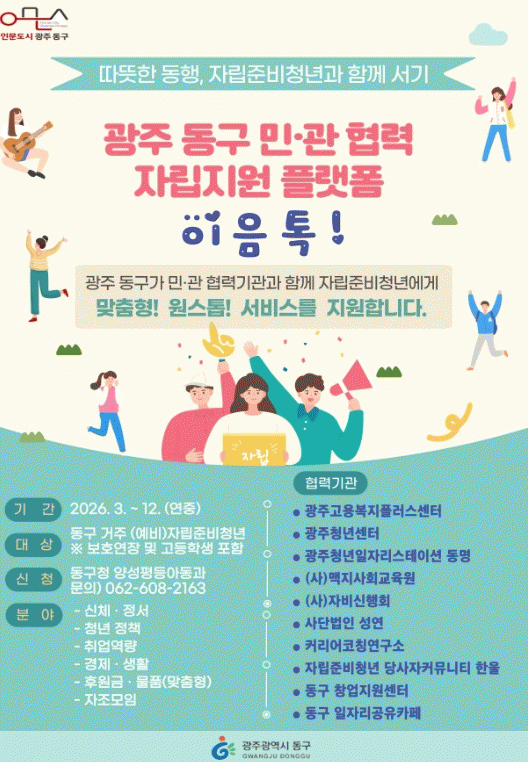 [´º½ºÅë ±è±¤¿ ±âÀÚ] ±¤ÁÖ µ¿±¸´Â º¸È£ Á¾·á 5³â À̳» ÀÚ¸³ Áغñ û³âÀ» ´ë»óÀ¸·Î ¹Î¡¤°ü Çù·Â ÀÚ¸³Áö¿ø Ç÷§Æû ¡®ÀÌÀ½Åå!¡¯ »ç¾÷À» Áö³ÇØ¿¡ À̾î 2026³â¿¡µµ Áö¼Ó ÃßÁøÇÑ´Ù°í ¹àÇû´Ù.