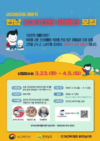 [´º½ºÅë ±è±¤¿ ±âÀÚ]Àü¶ó³²µµ´Â ¾ÆºüÀÇ À°¾Æ Âü¿©¸¦ È®´ëÇÏ°í °¡Á· Áß½ÉÀÇ °Ç°ÇÑ ¾çÀ°¹®È¸¦ È®»êÇϱâ À§ÇØ 2026³â Á¦8±â Àü³² 100ÀÎÀÇ ¾Æºü´Ü Âü¿©ÀÚ¸¦ ¸ðÁýÇÑ´Ù.