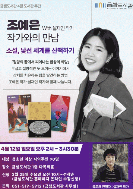 [´º½ºÅë °û¸íÈÆ ±âÀÚ]ºÎ»ê ±ÝÁ¤±¸ ±Ý»ùµµ¼°üÀº ¿À´Â 4¿ù 12ÀÏ ÀÏ¿äÀÏ ¿ÀÈÄ 2½Ã ±Ý»ùµµ¼°ü 1Ãþ ´Ù¸ñÀûȦ¿¡¼ 'Á¶¿¹Àº ÀÛ°¡¿ÍÀÇ ¸¸³²'À» °³ÃÖÇÑ´Ù.