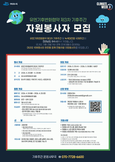 [´º½ºÅë ±è±¤¿ ±âÀÚ]¿©¼ö½Ã´Â ¿À´Â 4¿ù °³ÃֵǴ ¡®À¯¿£±âÈĺ¯ÈÇù¾à Á¦3Â÷ ±âÈÄÁÖ°£(UN Climate Change Week 3)¡¯°ú ¡®³ì»ö´ëÀüȯ(GX) ±¹Á¦ÁÖ°£¡¯À» ¾ÕµÎ°í ¼¼°èÀûÀÎ ±âÈÄ Á¤Ã¥ ÇöÀåÀ» ÇÔ²² ¸¸µé¾î°¥ ÀÚ¿øºÀ»çÀÚ 120¸íÀ» ¸ðÁýÇÑ´Ù°í ¹àÇû´Ù.