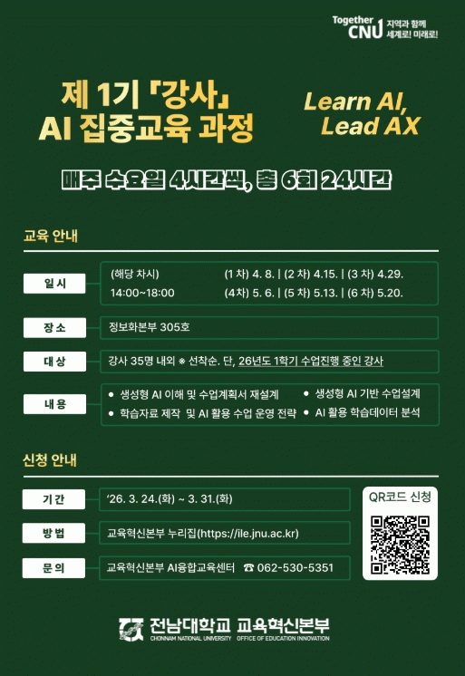 30ÀÏ Àü³²´ëÇб³¿¡ µû¸£¸é, ±³À°Çõ½Åº»ºÎ(º»ºÎÀå Á¤Àº°æ)´Â ¡®Á¦1±â °»ç AI ¿ª·® °È ÁýÁß±³À° °úÁ¤¡¯À» ¿î¿µÇÑ´Ù.