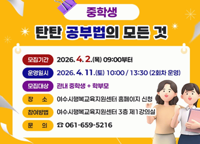 ¿©¼ö½Ã°¡ ¿À´Â 4¿ù 11ÀÏ Åä¿äÀÏ ¿©¼ö½ÃÇູ±³À°Áö¿ø¼¾ÅÍ¿¡¼ °ü³» ÀçÇÐ ÁßÀÎ ÁßÇлý°ú Çкθ𸦠´ë»óÀ¸·Î ¡®ÁßÇлý źź °øºÎ¹ýÀÇ ¸ðµç °Í¡¯À» °³ÃÖÇÑ´Ù.