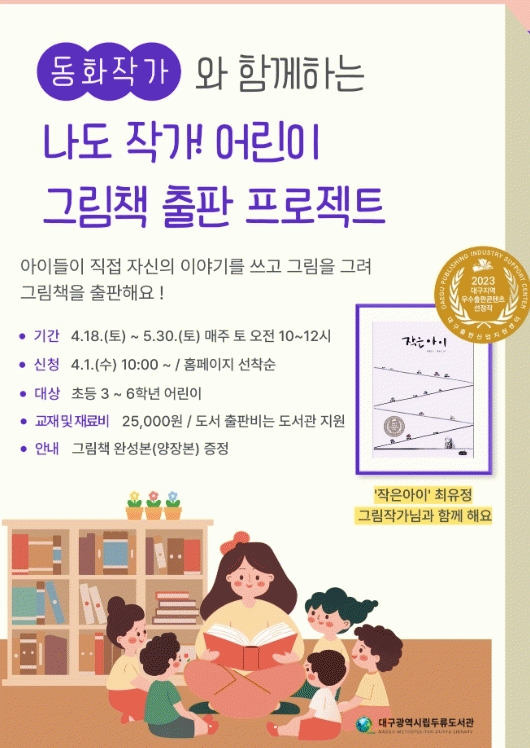 [´º½ºÅë ¾È»óµ· ±âÀÚ] ´ë±¸½Ã±³À°Ã» »êÇÏ µÎ·ùµµ¼°üÀº ¾î¸°À̵éÀÌ Á÷Á¢ ÀÛ°¡°¡ µÇ¾î ÀڽŸ¸ÀÇ Ã¢ÀÇÀûÀÎ À̾߱â¿Í ±×¸²À» ÇÑ ±ÇÀÇ Ã¥À¸·Î ¿«¾îº¸´Â ¡®³ªµµ ÀÛ°¡! ¾î¸°ÀÌ ±×¸²Ã¥ ÃâÆÇ ÇÁ·ÎÁ§Æ®¡¯¸¦ ¿î¿µÇÑ´Ù°í ¹àÇû´Ù.