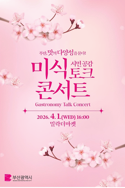 [´º½ºÅë °û¸íÈÆ ±âÀÚ] ºÎ»ê½Ã´Â ¿À´Ã(1ÀÏ) ¿ÀÈÄ 4½Ã ¹Ð¶ô´õ¸¶ÄÏ¿¡¼ 'ºÎ»ê, ¸ÀÀÇ ´Ù¾ç¼ºÀ» ¹¯´Ù!' ½Ã¹Î °ø°¨¹Ì½Ä ÅäÅ© ÄܼƮ¸¦ °³ÃÖÇØ 2026³â ¹Ì½Ä°ü±¤ Á¤Ã¥ ¹æÇâÀ» ½Ã¹Î°ú °øÀ¯ÇÑ´Ù°í ¹àÇû´Ù.