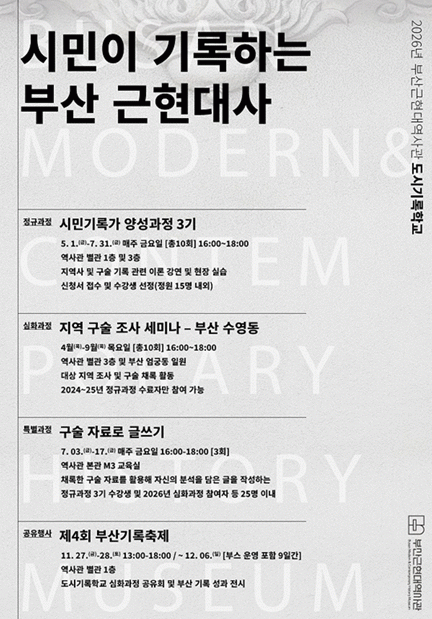 [´º½ºÅë °û¸íÈÆ ±âÀÚ] ºÎ»ê±ÙÇö´ë¿ª»ç°üÀº 2026³â ½Ã¹Î ´ë»ó ±â·Ï ÇÁ·Î±×·¥ÀÇ ÀÏȯÀ¸·Î 'µµ½Ã±â·ÏÇб³'¸¦ ¿î¿µÇÑ´Ù°í ¹àÇû´Ù.