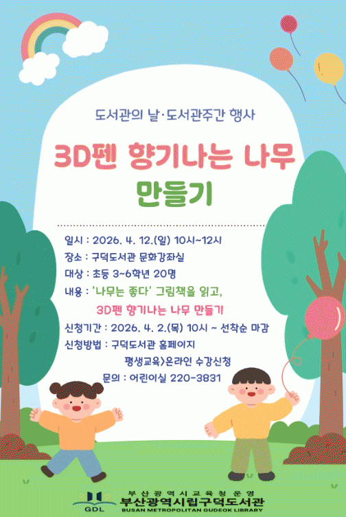 [´º½ºÅë °û¸íÈÆ ±âÀÚ] ºÎ»ê±¤¿ª½Ã¸³±¸´öµµ¼°üÀº ¿À´Â 12ÀÏ µµ¼°ü ¹®È°Á½ǿ¡¼ ÃʵîÇб³ 3~6Çгâ 20¸íÀ» ´ë»óÀ¸·Î ¡®3DÆæ Çâ±â³ª´Â ³ª¹« ¸¸µé±â¡¯¸¦ ¿î¿µÇÑ´Ù.