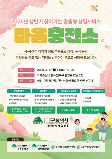 [´º½ºÅë ¾È»óµ· ±âÀÚ]´ë±¸±¤¿ª½Ã Á¾ÇÕº¹Áöȸ°üÀº 4¿ù 3ÀÏ ºÏ±¸ µ¿Ãµµ¿ ¼ÒÀç Ä«ÆäÁ¶¾È³ª Ä¥°îÁ¡¿¡¼ 2026³â »ó¹Ý±â ã¾Æ°¡´Â ÇöÀå»ó´ã ÇÁ·Î±×·¥ ¡®¸¶À½ÃæÀü¼Ò¡¯¸¦ ¿î¿µÇÑ´Ù.