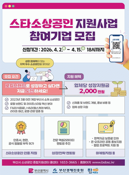 [´º½ºÅë °û¸íÈÆ ±âÀÚ] ºÎ»ê½Ã´Â ¿À´Ã(2ÀÏ)ºÎÅÍ ¿À´Â 4¿ù 15ÀϱîÁö '2026³â ºÎ»ê½Ã ½ºÅ¸¼Ò»ó°øÀÎ Áö¿ø»ç¾÷' Âü¿©±â¾÷À» ¸ðÁýÇÑ´Ù°í ¹àÇû´Ù.