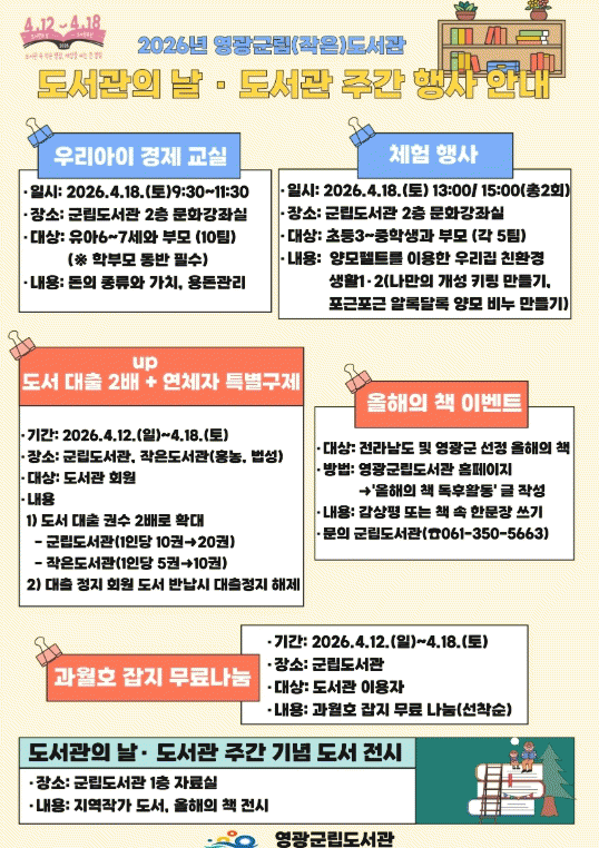 ¡®µµ¼°ü ¼Ó ÀÛÀº Æîħ, ¼¼»óÀ» ¿©´Â Å« ¿¸²¡¯À̶õ ÁÖÁ¦·Î ±º¹ÎµéÀÇ Âü¿©¸¦ È®´ëÇϰí, µµ¼°üÀÇ °ø°øÀû °¡Ä¡¿Í ¿ªÇÒ¿¡ ´ëÇÑ ÀνÄÀ» ³ôÀ̱â À§ÇØ ¸¶·ÃµÈ µµ¼°ü ÁÖ°£ üÇè ÇÁ·Î±×·¥ ¡ãÀ¯¾Æ¿Í ºÎ¸ð ´ë»ó ¡®¿ì¸® ¾ÆÀÌ °æÁ¦ ±³½Ç(6~7¼¼)¡¯ ¡ã¡®¾ç¸ðÆçÆ®¸¦ ÀÌ¿ëÇÑ ¿ì¸®Áý ģȯ°æ »ýȰ¡¯ ¿Ü ¡ãÁö¿ªÀÛ°¡ µµ¼ Àü½Ã ¡ã¿ÃÇØÀÇ Ã¥ °¨»óÆò À̺¥Æ®¸¦ ÁøÇàÇÑ´Ù.