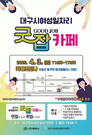 [´º½ºÅë ¾È»óµ· ±âÀÚ] ´ë±¸±¤¿ª½Ã´Â Ãë¾÷À» Èñ¸ÁÇÏ´Â °æ·Â´ÜÀý ¹× ¹ÌÃë¾÷ ¿©¼ºÀ» À§ÇØ 4¿ù 3ÀÏ ¿ÀÀü 11½ÃºÎÅÍ ºÏ±¸ ¼ÒÀç ¡®Ä«Æä Á¶¾È³ª(Ä¥°îÁ¡)¡¯¿¡¼ ¿ÃÇØ ù ¡®Ã£¾Æ°¡´Â ¿©¼ºÀÏÀÚ¸® ±ÂÀâ(Good Job)Ä«Æä¡¯¸¦ °³ÃÖÇÑ´Ù.