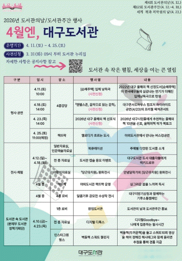 [´º½ºÅë ¾È»óµ· ±âÀÚ] ´ë±¸µµ¼°üÀº 4¿ù µµ¼°üÀÇ ³¯(4¿ù 12ÀÏ)°ú µµ¼°üÁÖ°£(4¿ù 12ÀÏ~18ÀÏ), ¼¼°è Ã¥ÀÇ ³¯(4¿ù 23ÀÏ)À» ¸Â¾Æ ¿À´Â 4¿ù 10ÀϺÎÅÍ 25ÀϱîÁö ½Ã¹ÎµéÀ» À§ÇÑ Ç³¼ºÇÑ µ¶¼¹®È Çà»ç¸¦ °³ÃÖÇÑ´Ù.