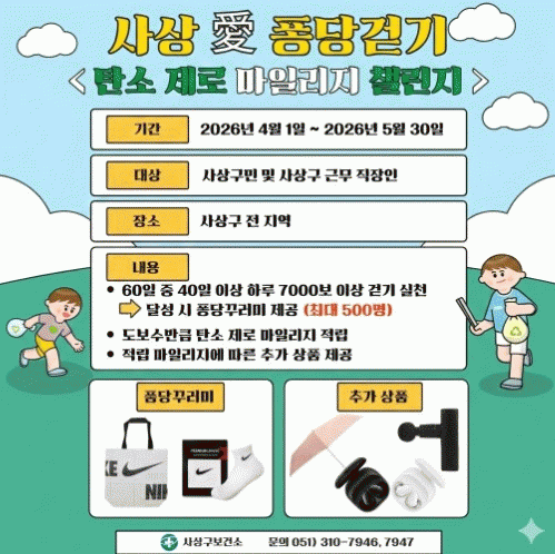 [´º½ºÅë °û¸íÈÆ ±âÀÚ]»ç»ó±¸º¸°Ç¼Ò´Â ÀÏ»ó ¼Ó °È±â ½ÇõÀ²À» ³ôÀÌ°í °Ç°ÁõÁøÀ» À§ÇØ 4¿ù 1ÀϺÎÅÍ 5¿ù 30ÀϱîÁö µÎ ´Þ°£ ¡®2026³â »ç»óÆþ´ç°È±â ź¼ÒÁ¦·Î ¸¶Àϸ®Áö 縰Áö¡¯¸¦ ÆîÄ£´Ù.