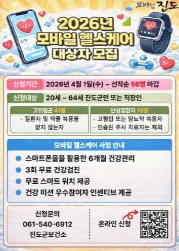 [´º½ºÅë ±è±¤¿ ±âÀÚ]Áøµµ±ºº¸°Ç¼Ò´Â 4¿ù 1ÀϺÎÅÍ ¡®2026³â ¸ð¹ÙÀÏ ÇコÄɾî 2±â¡¯ ´ë»óÀÚ 56¸íÀ» ¼±Âø¼øÀ¸·Î ¸ðÁýÇϰí ÀÖ´Ù.