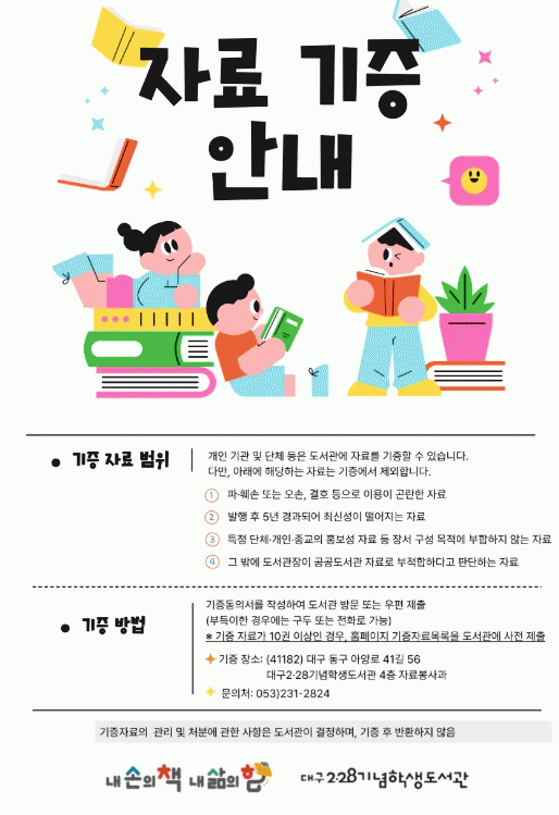 [´º½ºÅë ¾È»óµ· ±âÀÚ] ´ë±¸½Ã±³À°Ã» 10°³ °ø°øµµ¼°üÀº Áö¿ª »çȸÀÇ µ¶¼¹®È Ȱ¼ºÈ¿Í Áö½ÄÁ¤º¸ ÀÚ¿ø °øÀ¯¸¦ À§ÇØ °³ÀÎ ¹× ±â°ü¡¤´Üü¸¦ ´ë»óÀ¸·Î ¾çÁúÀÇ ÀÚ·á ±âÁõÀ» 4¿ùºÎÅÍ ¿¬Áß Á¢¼öÇÑ´Ù°í ¹àÇû´Ù.