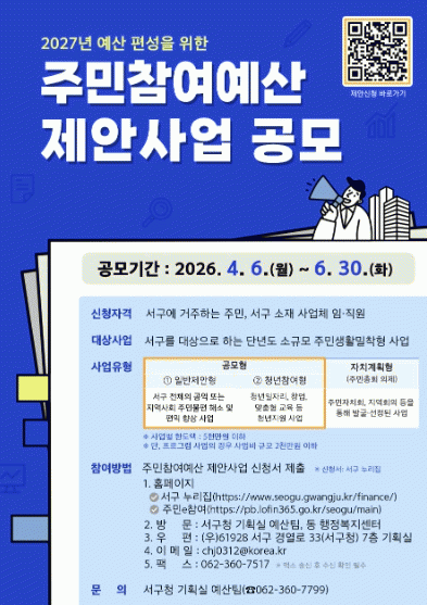 [´º½ºÅë ±è±¤¿ ±âÀÚ]±¤ÁÖ±¤¿ª½Ã ¼±¸°¡ ½ÇÁúÀûÀÎ ÁÖ¹ÎÁÖ±Ç °È¸¦ À§ÇØ ¡®ÁÖ¹ÎÂü¿©¿¹»ê Á¦¾È»ç¾÷ °ø¸ð¡¯¸¦ 6¿ù 30ÀϱîÁö ÁøÇàÇÑ´Ù. À̹ø °ø¸ð´Â ³»³âµµ ¿¹»ê¿¡ ¹Ý¿µÇÒ ÁֹΠÁ¦¾È»ç¾÷À» ¸ðÁýÇÏ´Â °ÍÀ¸·Î ÀÌ´Þ 6ÀϺÎÅÍ Á¢¼ö¸¦ ½ÃÀÛÇÑ´Ù.