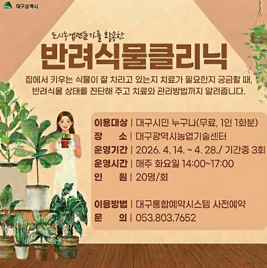 [´º½ºÅë ¾È»óµ· ±âÀÚ] ´ë±¸±¤¿ª½Ã³ó¾÷±â¼ú¼¾ÅÍ´Â µµ½Ã³ó¾÷ Àü¹®°¡¸¦ Ȱ¿ëÇØ ¿À´Â 4¿ù 14ÀϺÎÅÍ 28ÀϱîÁö ¸ÅÁÖ È¿äÀÏ, ÃÑ 3ȸ¿¡ °ÉÃÄ ¡®¹Ý·Á½Ä¹° Ŭ¸®´Ð¡¯À» ¿î¿µÇÑ´Ù.