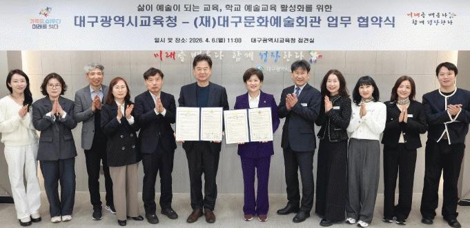 [´º½ºÅë ¾È»óµ· ±âÀÚ] ´ë±¸½Ã±³À°Ã»Àº 4¿ù 6ÀÏ ¿ÀÀü 11½Ã, ´ë±¸½Ã±³À°Ã» Á¢°ß½Ç¿¡¼ (Àç)´ë±¸¹®È¿¹¼úȸ°ü°ú ¡®Çб³ ¿¹¼ú±³À° Ȱ¼ºÈ¡¯¸¦ À§ÇÑ ¾÷¹«Çù¾à(MOU)À» ü°áÇß´Ù.