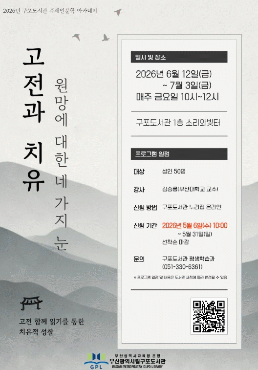 [´º½ºÅë °û¸íÈÆ ±âÀÚ] ºÎ»ê±¤¿ª½Ã¸³±¸Æ÷µµ¼°üÀº ¿À´Â 5¿ù 6ÀϺÎÅÍ 7¿ù 3ÀϱîÁö µµ¼°ü¿¡¼ ¼ºÀÎ 80¸íÀ» ´ë»óÀ¸·Î ¡®2026³â »ó¹Ý±â ÁÖÁ¦Àι®ÇÐ ¾ÆÄ«µ¥¹Ì¡¯¸¦ ¿î¿µÇÑ´Ù.