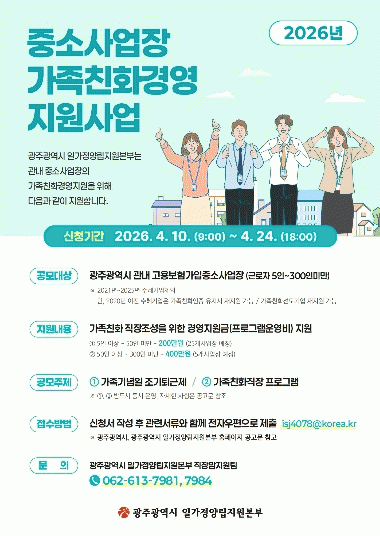 [´º½ºÅë ±è±¤¿ ±âÀÚ]±¤ÁÖ±¤¿ª½Ã Àϰ¡Á¤¾ç¸³Áö¿øº»ºÎ´Â ¡®2026³â °¡Á·Ä£È°æ¿µ Áö¿ø»ç¾÷¡¯¿¡ Âü¿©ÇÒ Áö¿ª Áß¼Ò»ç¾÷Àå 30°÷À» ¿À´Â 10ÀϺÎÅÍ 24ÀϱîÁö ¸ðÁýÇÑ´Ù.