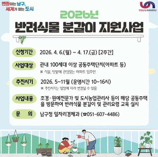 [´º½ºÅë °û¸íÈÆ ±âÀÚ]ºÎ»ê ³²±¸´Â ±¸¹ÎµéÀÇ ¹Ý·Á½Ä¹° °ü¸®¿¡ ´ëÇÑ ÀÌÇØ¸¦ µ½°í °ü¸® ´É·ÂÀ» ³ôÀ̱â À§ÇØ ¡®2026³â ¹Ý·Á½Ä¹° ºÐ°¥ÀÌ Áö¿ø»ç¾÷¡¯¿¡ Âü¿©ÇÒ °øµ¿ÁÖÅÃÀ» ¸ðÁýÇÑ´Ù°í ¹àÇû´Ù.