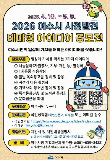 [´º½ºÅë ±è±¤¿ ±âÀÚ]¿©¼ö½Ã´Â ½Ã¹ÎµéÀÇ Âü½ÅÇϰí âÀÇÀûÀÎ ÀǰßÀ» Á¤Ã¥¿¡ ¹Ý¿µÇØ ¡®½Ã¹ÎÀÌ Âü¿©ÇÏ´Â ½ÃÁ¤¡¯À» ½ÇÇöÇϰíÀÚ ¿À´Â 4¿ù 10ÀϺÎÅÍ 5¿ù 8ÀϱîÁö ¡®2026³â ¿©¼ö½Ã ½ÃÁ¤¹ßÀü Å׸¶Çü ¾ÆÀ̵ð¾î °ø¸ðÀü¡¯À» ½Ç½ÃÇÑ´Ù°í ¹àÇû´Ù.