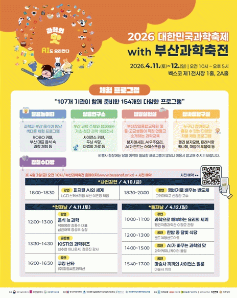[´º½ºÅë °û¸íÈÆ ±âÀÚ] ºÎ»ê½Ã´Â ¿À´Â 4¿ù 11ÀϺÎÅÍ 12ÀϱîÁö ÀÌÆ²°£ º¤½ºÄÚ(BEXCO) Á¦1Àü½ÃÀå¿¡¼ ¿¸®´Â '2026 ´ëÇѹα¹ °úÇÐÃàÁ¦ with ºÎ»ê°úÇÐÃàÀü'¿¡¼ 'ÂøÇÑ ¿¡³ÊÁö Çб³ Plus' üÇè ºÎ½º¸¦ ¿î¿µÇÑ´Ù°í ¹àÇû´Ù.