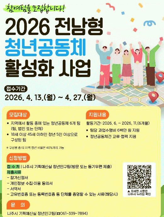 ³ªÁÖ½Ã, 2026³â ¡®Ã»³â°øµ¿Ã¼ Ȱ¼ºÈ »ç¾÷¡¯ Âü¿©ÆÀ ¸ðÁý