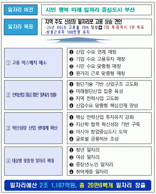 Á¾ÇÕ°èȹÀº '½Ã¹ÎÇູ ¹Ì·¡ ÀÏÀÚ¸® Á߽ɵµ½Ã ºÎ»ê'À» ºñÀüÀ¸·Î ¡ã°í¿ë ¹Ì½º¸ÅÄ¡ ÇØ¼Ò ¡ãÀü·«»ê¾÷ Á᫐ ÁÁÀº ÀÏÀÚ¸® âÃâ ¡ãÇõ½Å¼ºÀå »ê¾÷ »ýŰè È®»ê ¡ã´ë»óº° ¸ÂÃãÇü ÀÏÀÚ¸® È®´ëÀÇ 4´ë Àü·« 16°³ ½Çõ °úÁ¦·Î ±¸¼ºµÆ´Ù.