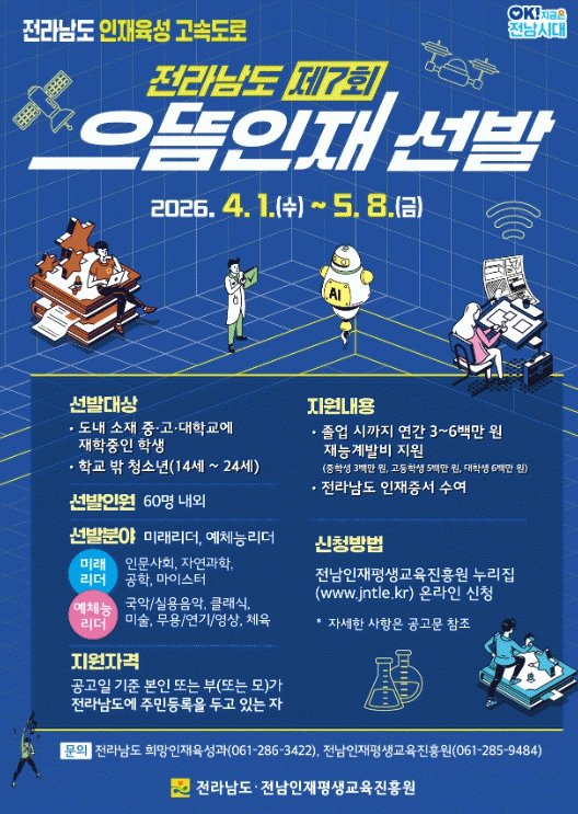 [´º½ºÅë ±è±¤¿ ±âÀÚ] Àü¶ó³²µµ°¡ ¹Ì·¡ ÀÎÀ縦 ¹ß±¼¡¤À°¼ºÇϱâ À§ÇØ ¡®Á¦7ȸ Àü¶ó³²µµ À¸¶äÀÎÀç ¼±¹ß¡¯ Âü¿©ÀÚ¸¦ °ø°³ ¸ðÁýÇØ 60¸í¿¡°Ô ÃÖ´ë 600¸¸ ¿øÀ» Áö¿øÇÑ´Ù.