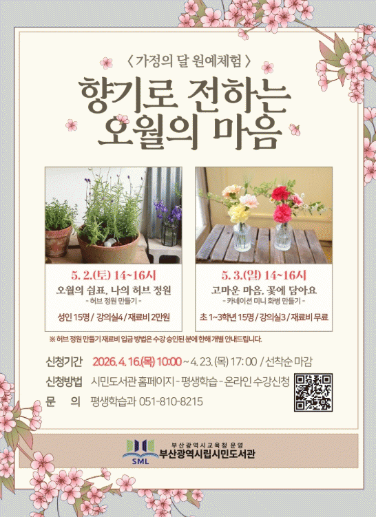 [´º½ºÅë °û¸íÈÆ ±âÀÚ] ºÎ»ê±¤¿ª½Ã¸³½Ã¹Îµµ¼°üÀº ¿À´Â 5¿ù 2Àϰú 3ÀÏ ½Ã¹Îµµ¼°ü °Àǽǿ¡¼ ¼ºÀΰú ÃʵîÇлý 30¸íÀ» ´ë»óÀ¸·Î °¡Á¤ÀÇ ´Þ ¿ø¿¹Ã¼Çè ¡®Çâ±â·Î ÀüÇÏ´Â ¿À¿ùÀÇ ¸¶À½¡¯À» ¿î¿µÇÑ´Ù.