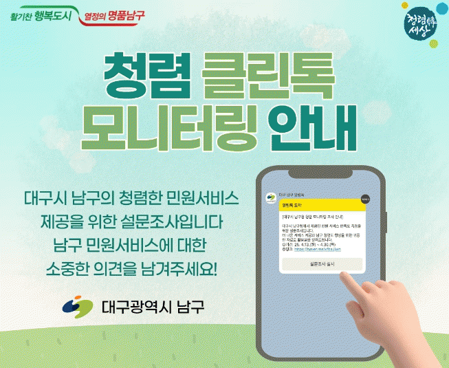 [´º½ºÅë ¾È»óµ· ±âÀÚ]´ë±¸ ³²±¸´Â ÇàÁ¤ÀÇ Åõ¸í¼ºÀ» °ÈÇÏ°í ºÎÆÐ Ãë¾à ºÐ¾ßÀÇ ½ÇÈ¿¼º ÀÖ´Â ¾÷¹« °³¼±À» À§ÇØ ¿ÜºÎ ¹Î¿øÀÎÀ» ´ë»óÀ¸·Î ÇÑ ¡®Ã»·Å Ŭ¸°Åå ¸ð´ÏÅ͸µ¡¯À» º»°ÝÀûÀ¸·Î ¿î¿µÇÑ´Ù°í ¹àÇû´Ù.