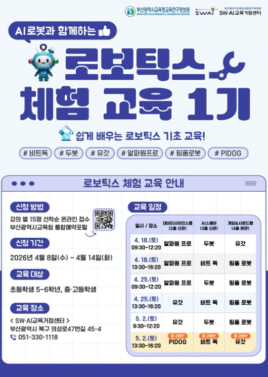 [´º½ºÅë °û¸íÈÆ ±âÀÚ] ºÎ»ê±¤¿ª½Ã±³À°Ã»±³À°¿¬±¸Á¤º¸¿øÀº ¿À´Â 18ÀϺÎÅÍ 5¿ù 2ÀϱîÁö 6ȸ¿¡ °ÉÃÄ ºÎ»êSW¡¤AI±³À°°ÅÁ¡¼¾ÅÍ¿¡¼ Ãʵî 5~6Çгâ, Áß¡¤°íµîÇлý 90¸íÀ» ´ë»óÀ¸·Î ¡®AI·Îº¿°ú ÇÔ²²ÇÏ´Â ·Îº¸Æ½½º üÇè ±³À°¡¯À» ¿î¿µÇÑ´Ù.