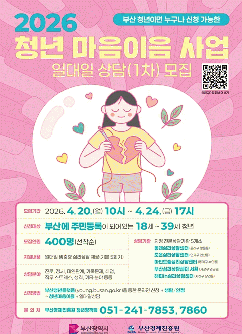 [´º½ºÅë °û¸íÈÆ ±âÀÚ] ºÎ»ê½Ã´Â Á¤¼ÀûÀ¸·Î ¾î·Á¿òÀ» °Þ´Â û³âµéÀÇ ¸¶À½ ȸº¹À» µ½±â À§ÇØ '2026³â û³â ¸¶À½ÀÌÀ½ »ç¾÷' Âü¿©ÀÚ¸¦ ¸ðÁýÇÑ´Ù°í ¹àÇû´Ù.
