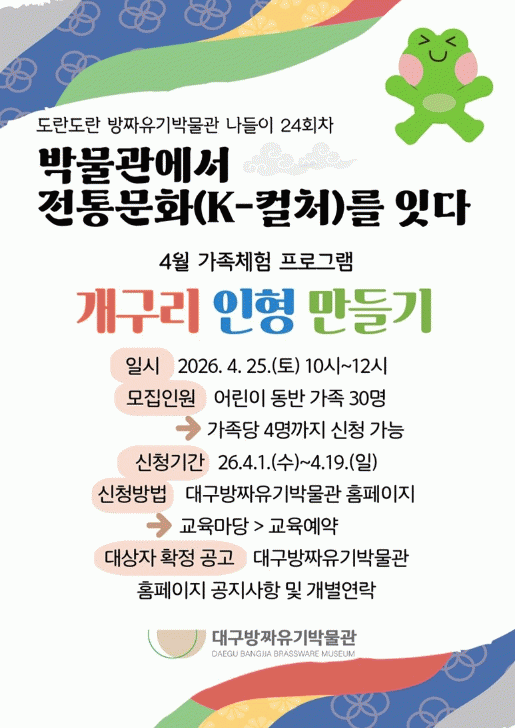[´º½ºÅë ¾È»óµ· ±âÀÚ] ´ë±¸¹®È¿¹¼úÁøÈï¿ø ¹Ú¹°°ü¿î¿µº»ºÎ ¼Ò¼Ó ´ë±¸¹æÂ¥À¯±â¹Ú¹°°üÀº ÈâÇÑ º½³¯ 4¿ù¿¡ ÀüÅë°ø¿¹ °¡Á·Ã¼Çè°ú ÆÈ°ø»ê ¿ª»ç¹®È ÀÌÇØ Ư°À» ±âȹÇÏ¿©, 4¿ù 25ÀÏ ¿ÀÀü 10½Ã¿¡ ¡®°³±¸¸® ÀÎÇü ¸¸µé±â¡¯ üÇèÀ», 4¿ù 28ÀÏ ¿ÀÈÄ 2½Ã¿¡ ¡®°í·Á ÅÂÁ¶ ¿Õ°Ç ÈĹéÁ¦ °ßÈͰú ÆÈ°ø»ê¡¯ °ÀǸ¦ °³ÃÖÇÑ´Ù.