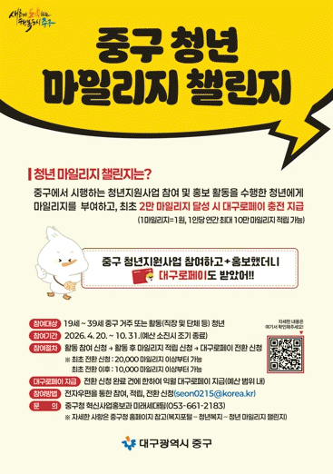 ¡®Ã»³â ¸¶Àϸ®Áö 縰Áö¡¯´Â Áß±¸¿¡¼ ÃßÁøÇϴ û³âÁö¿ø»ç¾÷ Âü¿©¿Í È«º¸ Ȱµ¿À» ¼öÇàÇÑ Ã»³â¿¡°Ô ¸¶Àϸ®Áö¸¦ ºÎ¿©Çϰí, ÀÏÁ¤ ±âÁØÀ» ´Þ¼ºÇÏ¸é ´ë±¸·ÎÆäÀÌ·Î ÀüÈ¯ÇØ Áö±ÞÇÏ´Â »ç¾÷ÀÌ´Ù. 1¸¶Àϸ®Áö´Â 1¿øÀ¸·Î ȯ»êµÇ¸ç, ¿¬°£ ÃÖ´ë 10¸¸ ¸¶Àϸ®Áö±îÁö ¹ÞÀ» ¼ö ÀÖ´Ù.