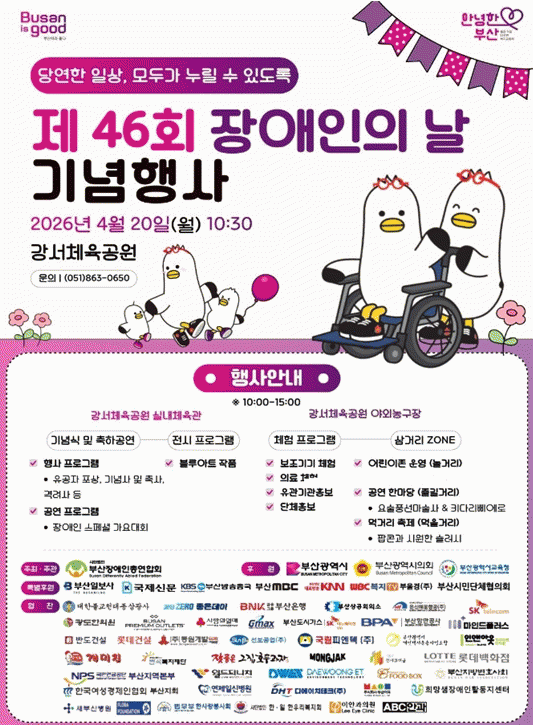 [´º½ºÅë °û¸íÈÆ ±âÀÚ] ºÎ»ê½Ã´Â ¿À´Ã(20ÀÏ) ¿ÀÀü 10½Ã 30ºÐ, °¼Ã¼À°°ø¿ø ½Ç³»Ã¼À°°ü¿¡¼ Àå¾ÖÀο¡ ´ëÇÑ ÀÌÇØ¸¦ ³ôÀ̰í Àå¾ÖÀΰú ºñÀå¾ÖÀÎÀÌ ÇÔ²² °ø°¨ÇÏ´Â ÀåÀ» ¸¶·ÃÇϱâ À§ÇØ 'Á¦46ȸ Àå¾ÖÀÎÀÇ ³¯ ±â³äÇà»ç'¸¦ °³ÃÖÇÑ´Ù°í ¹àÇû´Ù.