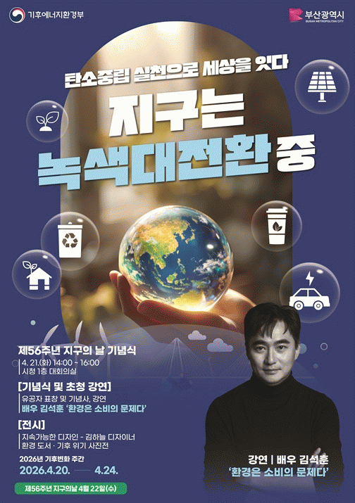 [´º½ºÅë °û¸íÈÆ ±âÀÚ] ºÎ»ê½Ã´Â 'Á¦56ÁÖ³â Áö±¸ÀÇ ³¯(4¿ù 22ÀÏ)'À» ¸Â¾Æ ¿À´Ã(20ÀÏ)ºÎÅÍ 24ÀϱîÁö 'Á¦18ȸ ±âÈĺ¯ÈÁÖ°£'À» ¿î¿µÇϰí, 'Áö±¸´Â ³ì»ö´ëÀüȯ Áß. ź¼ÒÁ߸³ ½ÇõÀ¸·Î ¼¼»óÀ» ÀÕ´Ù'¸¦ ÁÖÁ¦·Î ´Ù¾çÇÑ Çà»ç¸¦ °³ÃÖÇÑ´Ù°í ¹àÇû´Ù.