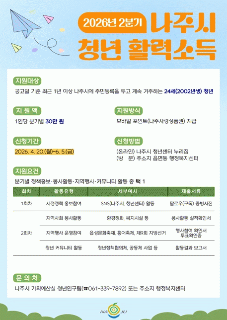 [´º½ºÅë ±è±¤¿ ±âÀÚ]Àü³² ³ªÁֽð¡ Áö¿ª û³âÀÇ »çȸÂü¿© È®´ë¿Í ¾ÈÁ¤Àû Á¤ÂøÀ» Áö¿øÇϱâ À§ÇØ °ø°øÈ°µ¿ Âü¿©¸¦ Á¶°ÇÀ¸·Î ºÐ±âº° 30¸¸ ¿øÀ» Áö±ÞÇÏ´Â ¡®Ã»³â Ȱ·Â¼Òµæ Áö¿ø»ç¾÷¡¯ 2ºÐ±â Âü¿©ÀÚ ¸ðÁý¿¡ ³ª¼±´Ù.